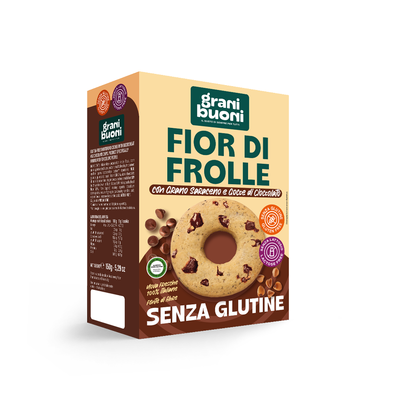 BISCOTTO FROLLINO SENZA GLUTINE CON GRANO SARACENO E GOCCE DI CIOCCOLATO. PRODOTTO SPECIFICAMENTE FORMULATO PER PERSONE INTOLLERANTI AL GLUTINE.
